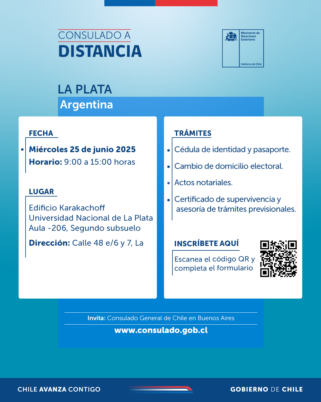 El día 11 de junio de 2025, el Consulado General de Chile en Buenos Aires, Argentina, se trasladará hasta La Plata para entregar trámites y servicios a compatriotas.