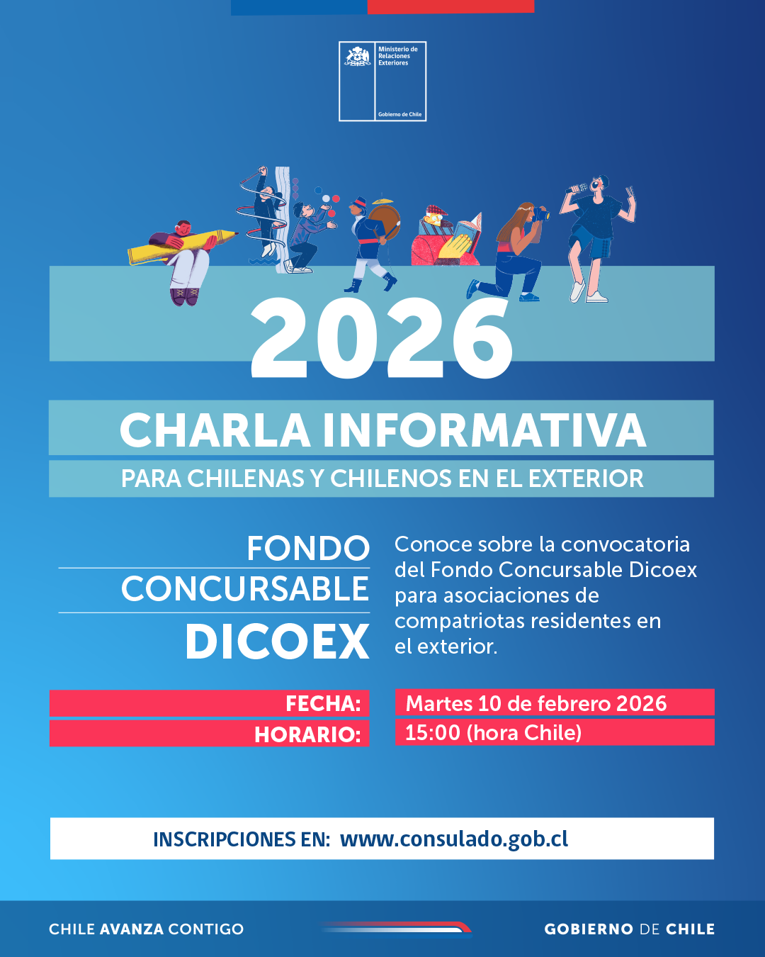 Invitamos a chilenas y chilenos residentes en el exterior a participar en la charla informativa sobre la convocatoria del Fondo Concursable DICOEX, para asociaciones de connacionales en el mundo.