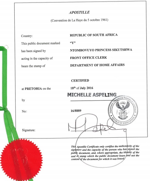 Dado que Sudáfrica forma parte del Convenio de la Apostilla desde 30-IV-1995, los documentos apostillados por ese país deben ser reconocidos por Chile a partir del 30 de agosto de 2016. Asimismo, los documentos apostillados por Chile deberán ser recibidos en este país.