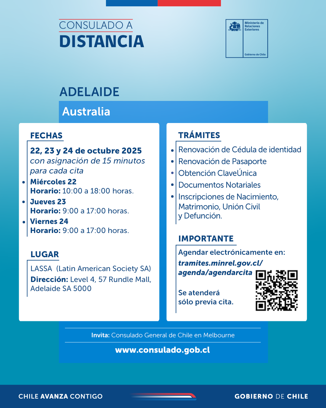 Los días 22, 23 y 24 de octubre, el Consulado General de Chile en Melbourne realizará atenciones a chilenas y chilenos en Adelaide en el marco de la actividad "Consulado a distancia"