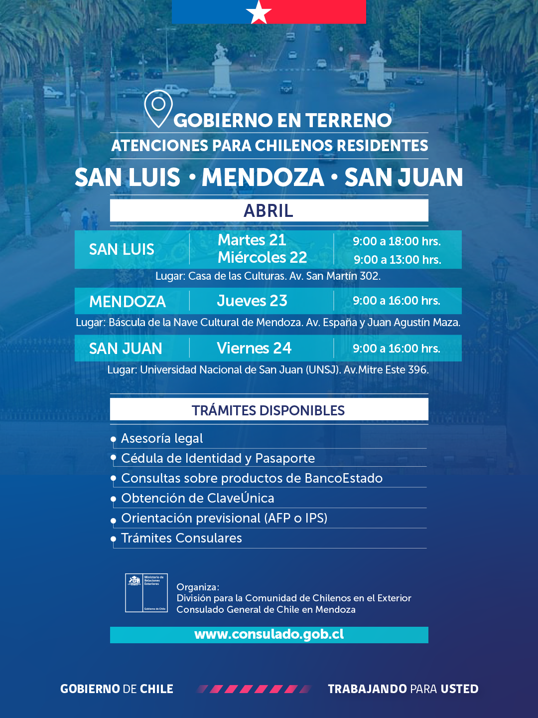 La División para la Comunidad de Chilenos en el Exterior (DICOEX), del Ministerio de Relaciones Exteriores de Chile, en conjunto con el Consulado General de Chile en Mendoza, Argentina, organiza la actividad “Gobierno en Terreno”, dirigida a chilenas y chilenos residentes en las provincias de San Luis, Mendoza y San Juan.