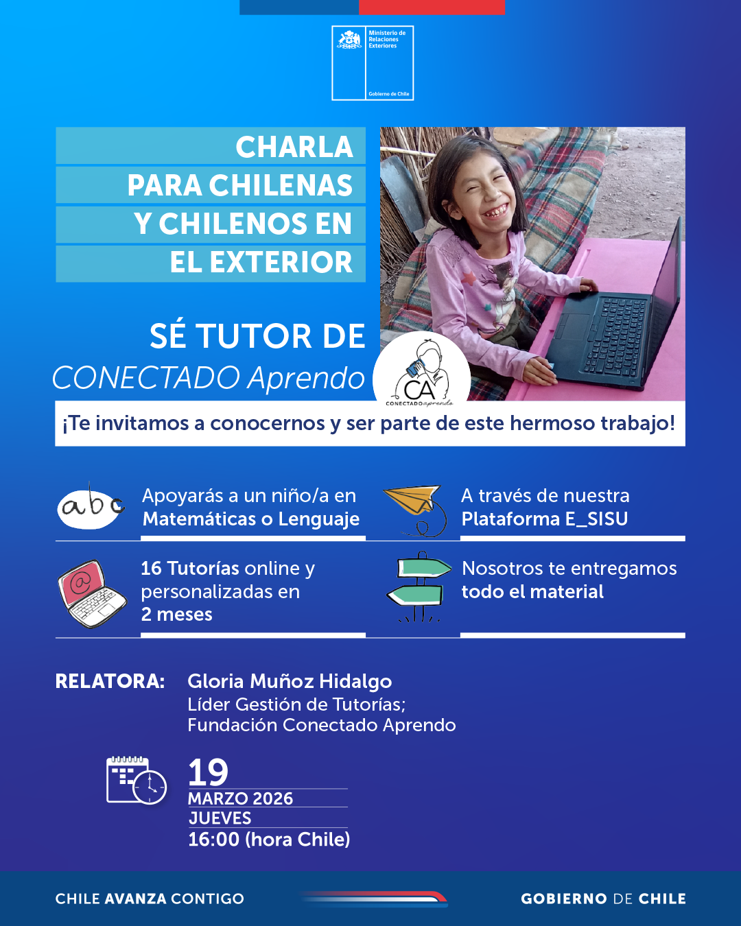 Invitamos a las chilenas y chilenos residentes en el exterior a participar en una charla informativa en línea, que realizaremos en conjunto con la Fundación Conectado Aprendo, la cual apoya a estudiantes de Chile que necesitan reforzar sus aprendizajes escolares.