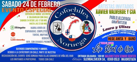 - El 24 de febrero, entre las 17:00 y las 22:00 horas se realizó un evento para apoyar las ollas comunes de Viña del Mar. La actividad se efectuó en Majorstuen Senior Senter, ubicado en Slemdalsveien 3A, 0369 Oslo, Majorstuen.